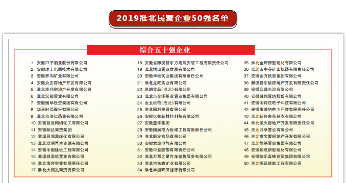獲淮北市2019年度民營企業(yè)排序綜合五十強(qiáng)