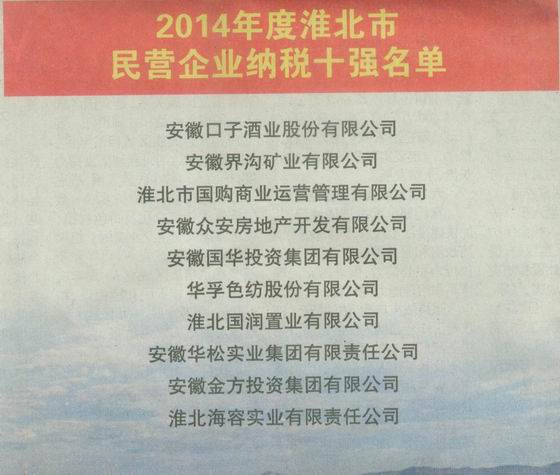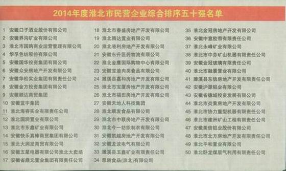 榮獲2014年度淮北市民營企業(yè)五十強及納稅十強