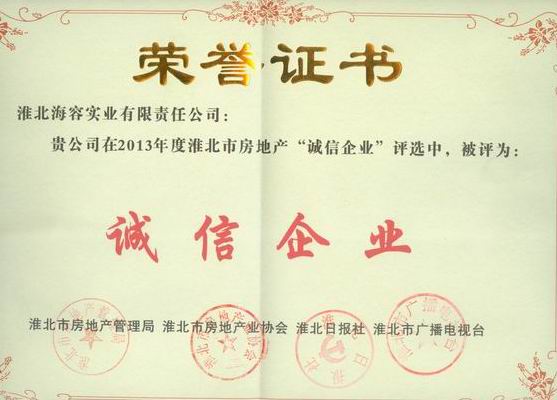 祝賀海容實(shí)業(yè)在2013年度被評(píng)為淮北房地產(chǎn)“誠(chéng)信企業(yè)”