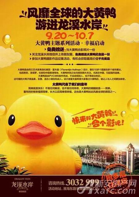 本次活動時間將從9月20日持續(xù)到10月7日,國慶期間不用外出也能與大黃鴨親密接觸。同時,海容龍溪水岸大黃鴨主題系列活動幸福啟幕,來訪客戶可免費贈送與大黃鴨親密合影照片一份。參加大黃鴨攝影作品征集活動,還有機會獲取最高價值千元獎品。